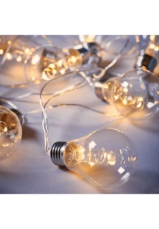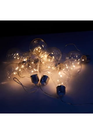 Die Bulb Lights Lichterkette bringt mit 10 LED in Glühbirnen-Optik echten Vintage Flair in Ihre vier Wände. Entdecken Sie die sanft leuchtenden Glühbirnen als stilvolle Lichtquelle. Ob als Winterzauber zur Weihnachtszeit oder an warmen Sommerabenden auf dem überdachten Balkon, die Lichter spenden genügend Licht, um jeden Abend gemütlich und einzigartig zu machen.