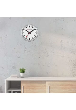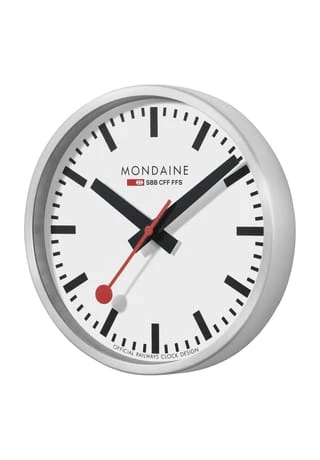 Industrial Design an der Wand! In ihrer Aluminium-Ausführung besticht die Mondaine Official Swiss Railways Clock durch das puristische und schlichte Design. Und dennoch schmückt diese Wanduhr mit 25cm Durchmesser in ihrem unverwechselbaren Zifferblatt und der markanten roten Sekundenkelle jeden Raum. Die Wanduhr hat einen schleichenden Sekundenzeiger.