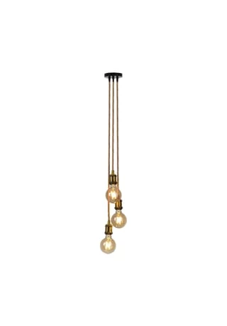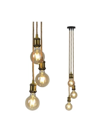 excl. 3x E27 max. 10W LED-Leuchtmittel IP20/SKII 220-240V~ 50Hz hges: 110cm; dges: 11cm Baldachin: d: 11cm; h: 2,5cm Kabellängen: 85cm/ 59cm/ 55,5cm Material: Metall (Aluminium), Jute Fassung: altmessing Baldachin: schwarz
