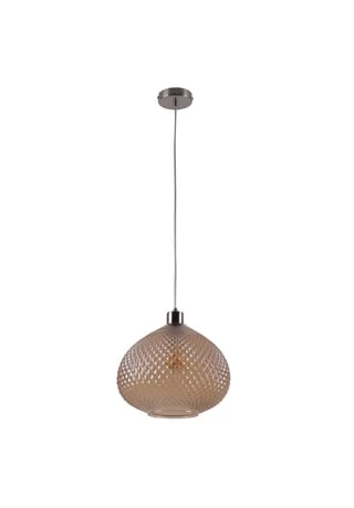 excl. 1x E27/max.40W 220-240V ~ 50/60Hz IP20/SKI Pendellänge: 90cm; transparent Gesamthöhe: 130cm Schirm: h: 23cm; d: 29cm Baldachin: h: 2,5cm; d: 10cm /chrome Material: Glas, Metall, Kunststoff Farbe: braun getönt