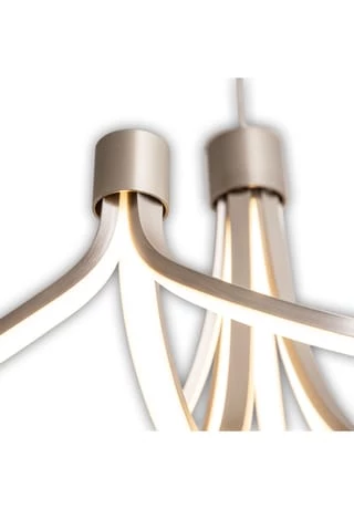 Die moderne Neuinterpretation eines Kronleuchters ist die attraktive LED Pendelleuchte „Festos“. Mit einem Durchmesser von 55 cm verbreitet sie direkt über Ihrem Esstisch eine wohnliche Atmosphäre und kann auch als allgemeine Beleuchtung an der Wohn- oder Schlafzimmerdecke genutzt werden. Das einzigartige Design zeigt ineinander verschlungene Lichtbänder, die dem Zentrum der Zuleitung an der Decke entspringen und die Form eines Kandelabers nachahmen. Dank ihrer dreistufigen Dimmbarkeit kann die dekorative LED Pendelleuchte „Festos“ die Raumsituation ganz nach Wunsch von hell bis gedämpft magisch verändern. Das außergewöhnliche Lichtobjekt punktet mit einer warmweißen Lichtfarbe, die aus 540 stromsparenden, fest verbauten LEDs stammt.