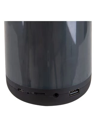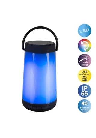 24x RGB-LED /5W 432lm Lebensdauer: ca. 20.000h incl. 1x Li-Ion/18650/1500mAh/3,7V Akku Input: 5V incl. USB-Kabel: 22cm /5V DC 1A IP65/SKIII Bluetooth Version: V4.2 BT-Reichweite: 10m Lautsprecher: 5W / 40HM Frequenzbereich: 2.4G SNR: 75DB Ladezeit: 3 Std. Leuchtdauer/Abspielzeit: 5-6 Std. Maße: h: 18cm; d: 9cm Material: Kunststoff Farbe: schwarz Lichtfarbe: bunt incl. Henkel