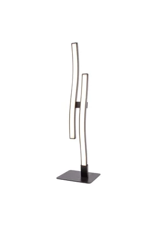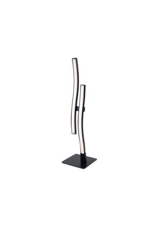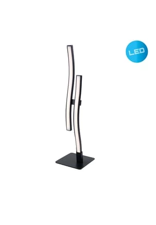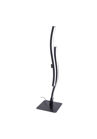 Die-2-flammige LED Tischleuchte „Onda“ überzeugt mit ihrem zeitlosen Design in der Farbe schwarzmatt. Sie ist das ideale Beleuchtungselement für den modern eingerichteten Wohnbereich. Die Leuchte mit ihren Lampenschirmen in leicht geschwungener Wellenform passt in geschmackvoll eingerichtete Wohnzimmer, Esszimmer oder Eingangsbereiche. Auf einem Schreibtisch, einem Beistelltisch oder auf einem niedrigen Sideboard platziert, kommt die Leuchte aus hochwertig verarbeitetem Aluminium, Eisen und Kunststoff sehr gut zur Geltung. Das warmweiße Licht der energieeffizienten LEDs sorgt in allen Wohnbereichen für eine angenehme und gemütliche Atmosphäre.