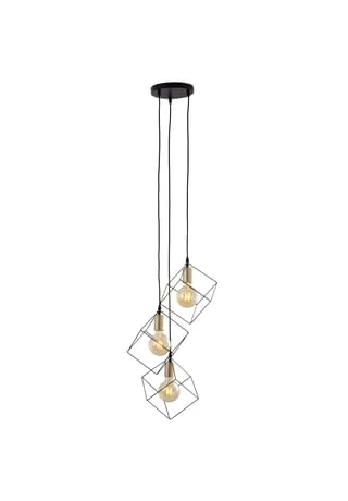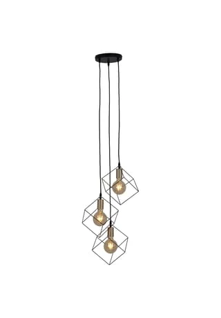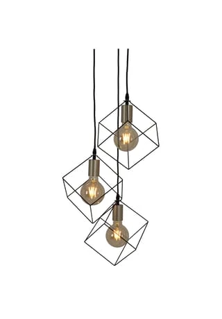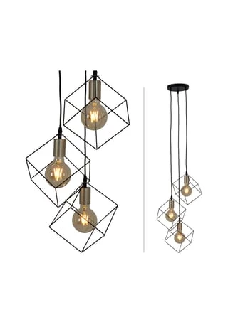 Die stylische Hängeleuchte Canto überzeugt durch den ausgefallenen Lampenschirm, der aus einem würfelförmigen Rahmen besteht. Große Filamentlampen runden das moderne Design der Leuchte ab.
