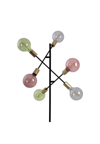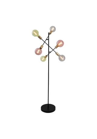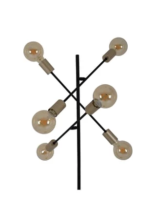 6x E27 max. 40W excl. Leuchtmittel IP20 /SKII 230V~ 50Hz Maße: h: 150cm; b: 49cm Fuß: h: 4,5cm; d: 28cm Zuleitung: 146cm; schwarz incl. Tippschalter/Fußschalter Material: Metall (Eisen), Kunststoff Farbe: Gestell schwarz, Lampenfassung gold