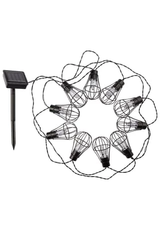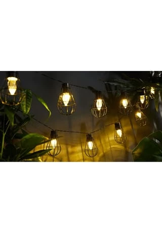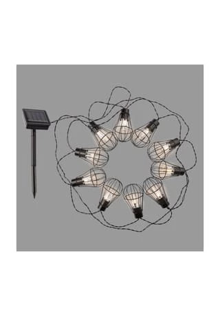 Für diese Outdoor-Lichterkette wird kein Stromanschluss benötigt – sie wird, ganz zeitgemäß, mit Solarenergie betrieben. Die zehn Gitterlampen im Retro-Look leuchten warmweiß und zaubern im Handumdrehen eine tolle Atmosphäre im Garten, auf der Terrasse oder dem Balkon.