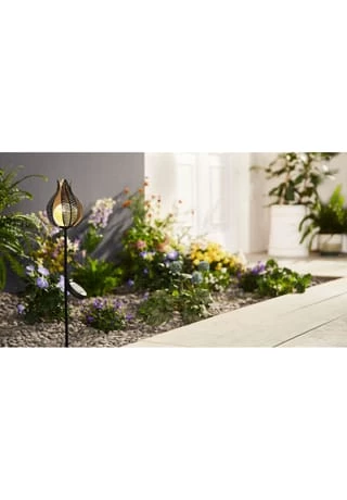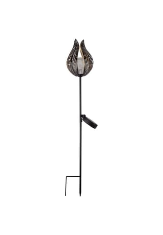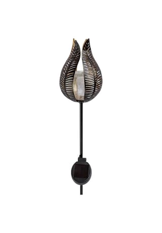 Die Solarleuchte wird einfach in die Erde gesteckt und ist auch tagsüber ein toller Blickfang im Garten, auf der Terrasse oder dem Balkon. Zwischen den filigran geformten Blütenblättern befindet sich eine Glaskugel, die leuchet, sobald die Dämmerung einsetzt. Das goldfarbene Innere der Blütenblätter reflektiert das Licht besonders schön.